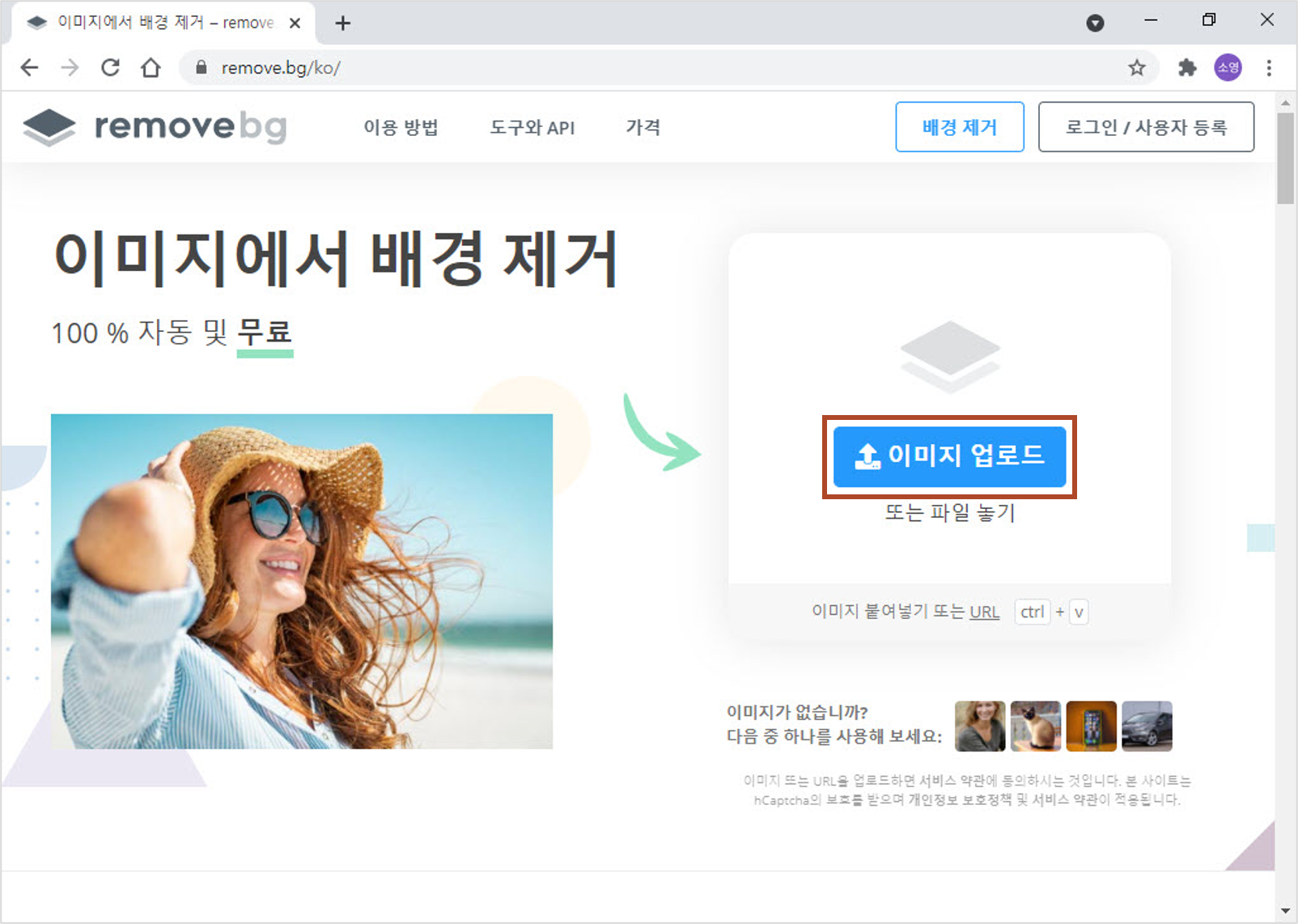 1. 배경 제거 사이트에(https://www.remove.bg/ko)에 접속한 후 <이미지 업로드>를 클릭합니다.