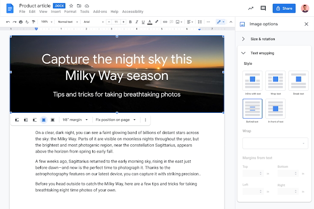 지난주 Google 은 문서 및 기타 작업 공간 앱의 상호 연결성을 향상시키는 일련의 기능으로 " 스마트 캔버스 "를 발표했습니다 . 이제 Google 문서 도구는 "텍스트 앞 또는 뒤에 이미지 배치"를 위한 간단한 기능을 제공합니다.