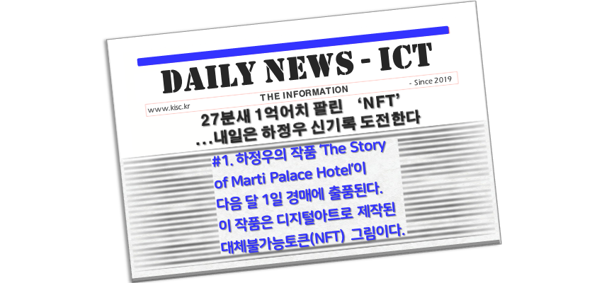 #1. 인기 배우 겸 화가인 하정우의 작품 ‘더 스토리 오브 마티 팰리스호텔’(The Story of Marti Palace Hotel)이 다음 달 1일 경매에 출품된다. 하정우의 첫 디지털아트 작품으로, 가격은 2만7000클레이(약 3000만원)다. 카카오가 개발한 암호화폐 클레이로만 거래되는 이 작품은, 일반 유화가 아닌 디지털아트로 제작된 대체불가능토큰(NFT) 그림이다. 평면 그림에 애니메이션과 사운드로 효과를 더했다.