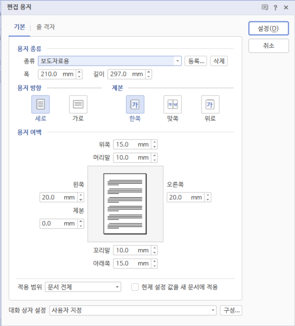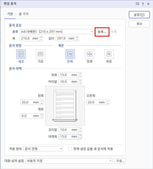 2. [편집 용지] 대화 상자의 [기본] 탭에서 용지 종류, 용지 방향, 용지 여백을 입력한 후 [등록]을 클릭합니다.