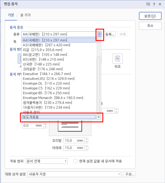 2. [편집 용지] 대화 상자의 [기본] 탭에서 [용지 종류]의 [종류] 목록 단추를 클릭하고 등록해 놓은 용지 이름 중 사용할 이름을 선택한 후 <설정>을 클릭합니다.