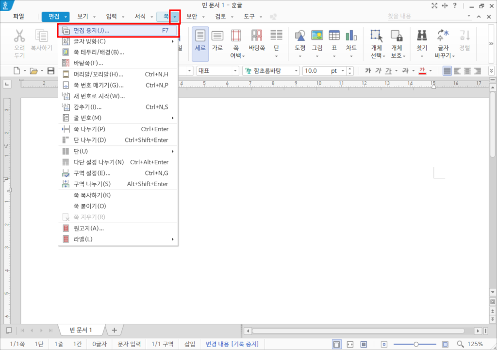 1. [쪽]-[편집 용지] 메뉴를 선택하거나 [F7] 키를 누릅니다.