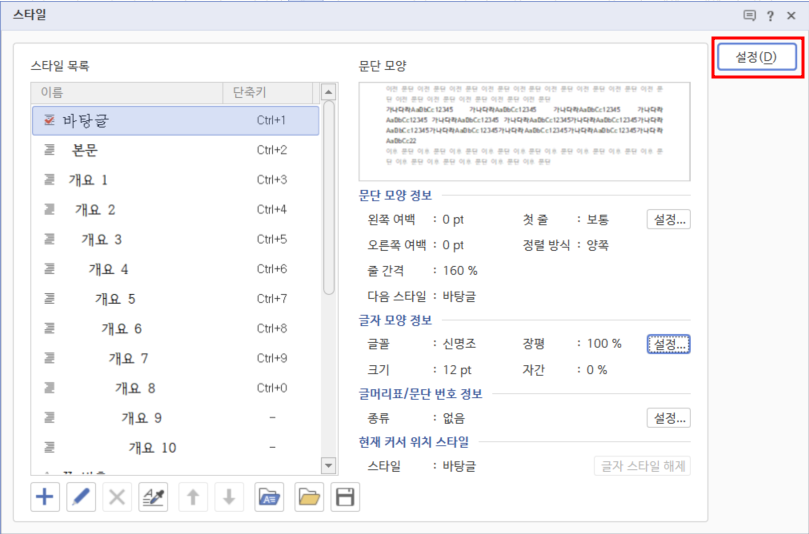 2. [스타일] 대화 상자의 [스타일 목록]에서 '바탕글'을 선택하고 [글자 모양 정보]에서 [설정]을 클릭합니다.