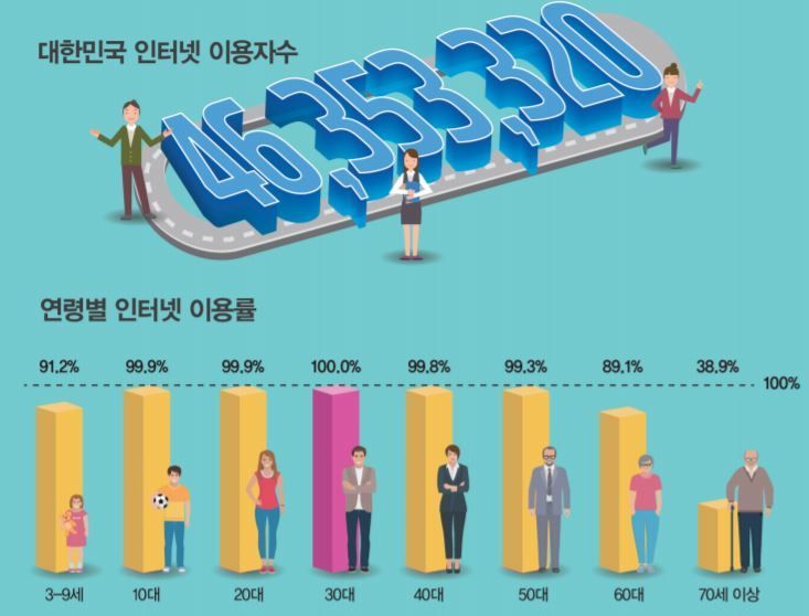 과학기술정보통신부가 26일 발표한 '2019 인터넷이용실태조사' 결과 국민 인터넷 이용률은 91.8%로 전년 대비 0.3%포인트 상승했다. 연령별로는 30대가 100%로 이어 10대와 20대(각 99.9%), 40대(99.8%), 50대(99.3%) 순이었다. 3~9세 유아동의 이용률도 91.2%, 60대의 이용률도 89.1%에 달했다.