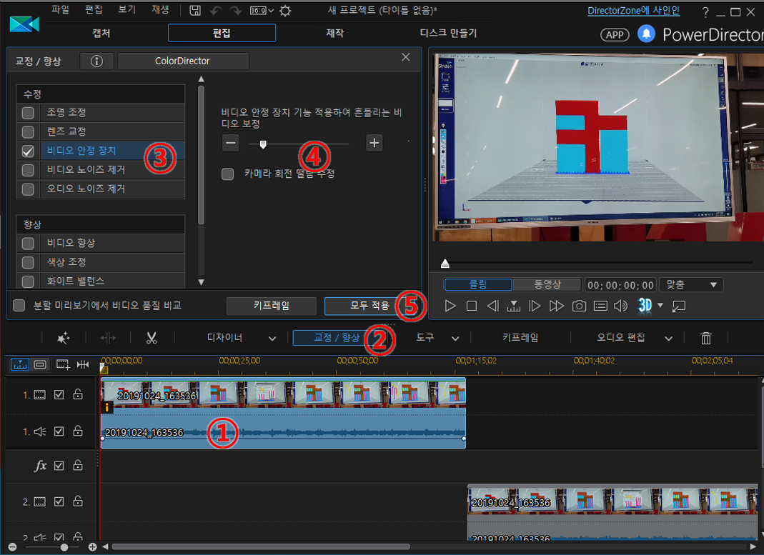 이러한 영상은 파워디렉터의 제어 슬라이더를 이용해 흔들림 보정을 할 수 있습니다.