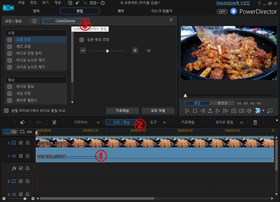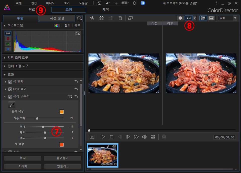 7. 색채, 채도, 명도등을 조정합니다.
