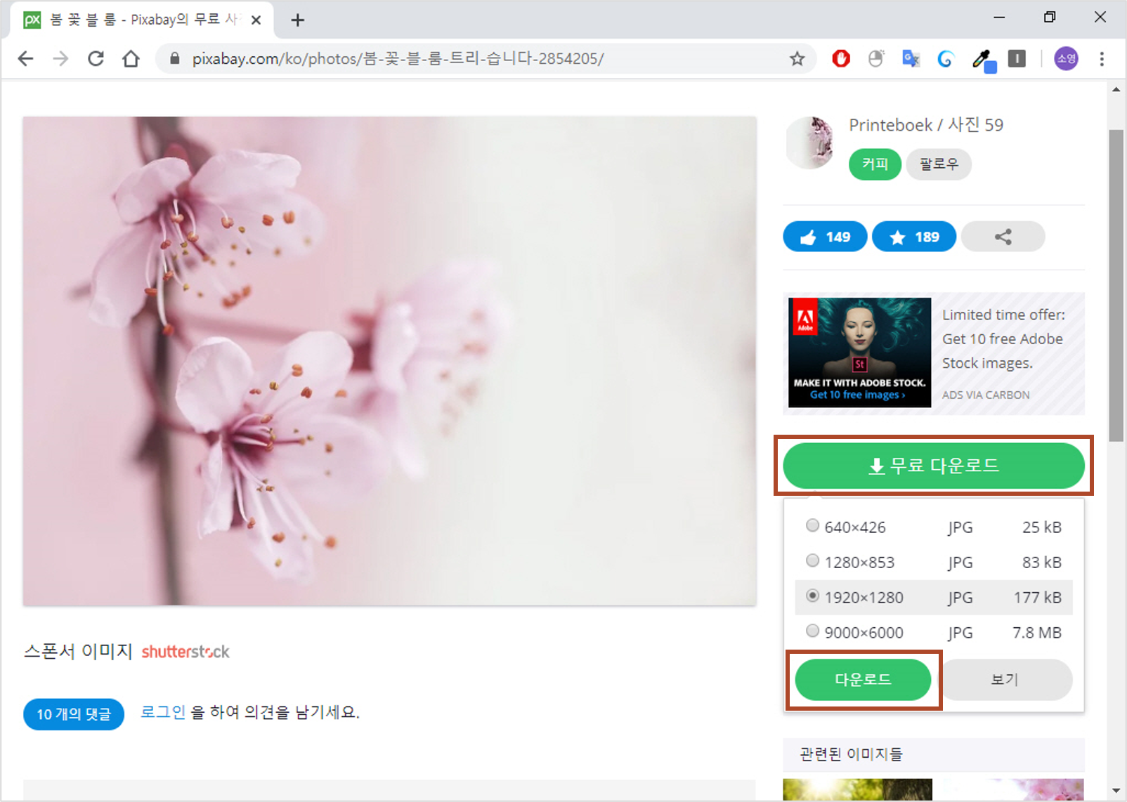 3. 저장할 그림을 선택한 후 오른쪽의 <무료 다운로드>를 클릭하고 다시 <다운로드>를 클릭합니다.
