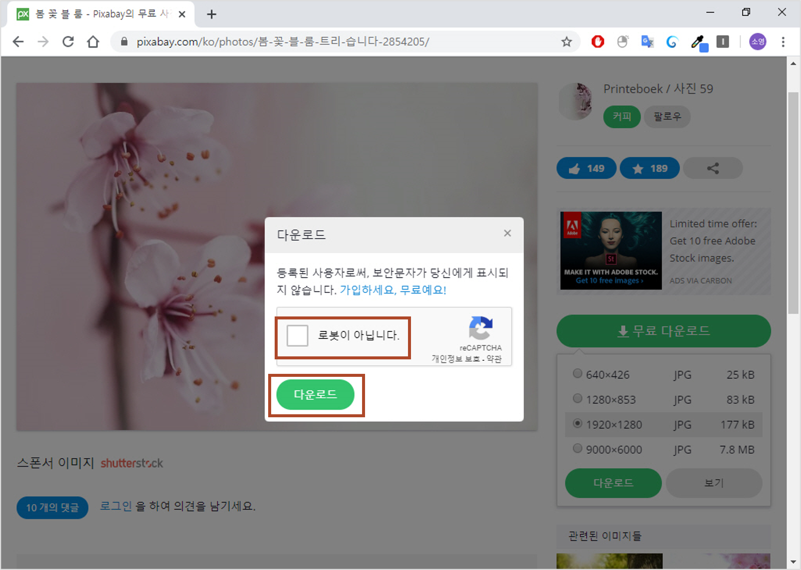 4. [로봇이 아닙니다.]에 체크한 후 <다운로드>를 클릭합니다.