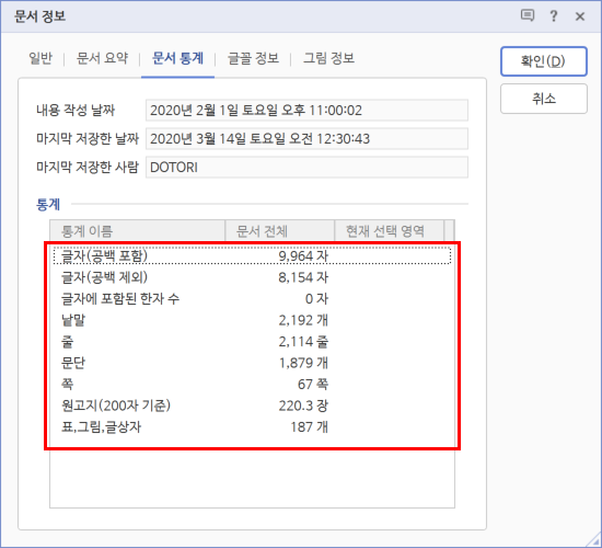 2. [문서 정보] 대화 상자의 [문서 통계] 탭에서 글자 수, 낱말 수 등의 통계를 확인한 후 <확인>을 클릭합니다.