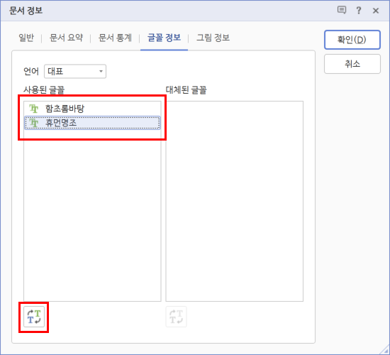 2. [문서 정보] 대화 상자의 [글꼴 정보] 탭에 있는 [사용된 글꼴] 목록에서 다른 글꼴로 바꿀 글꼴을 선택하고 [사용된 글꼴 바꾸기]를 클릭합니다.