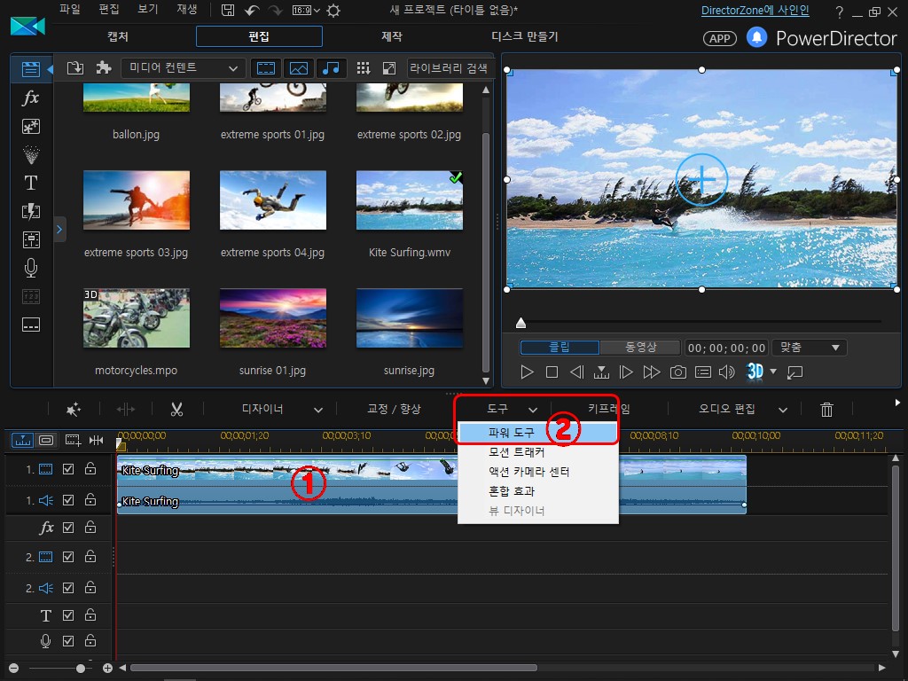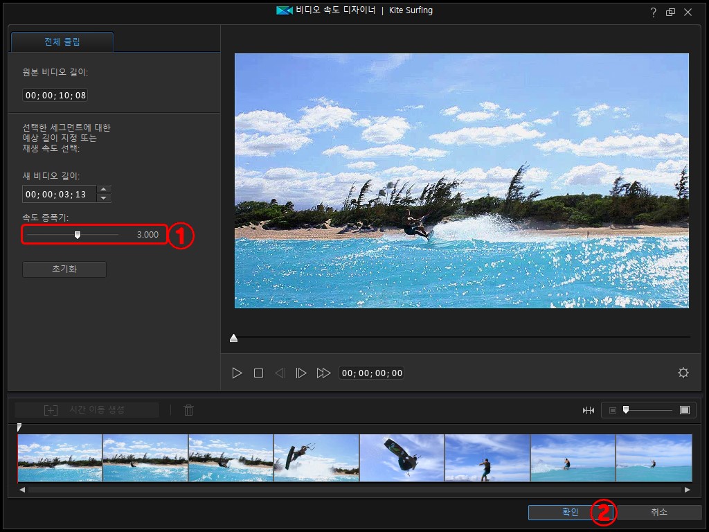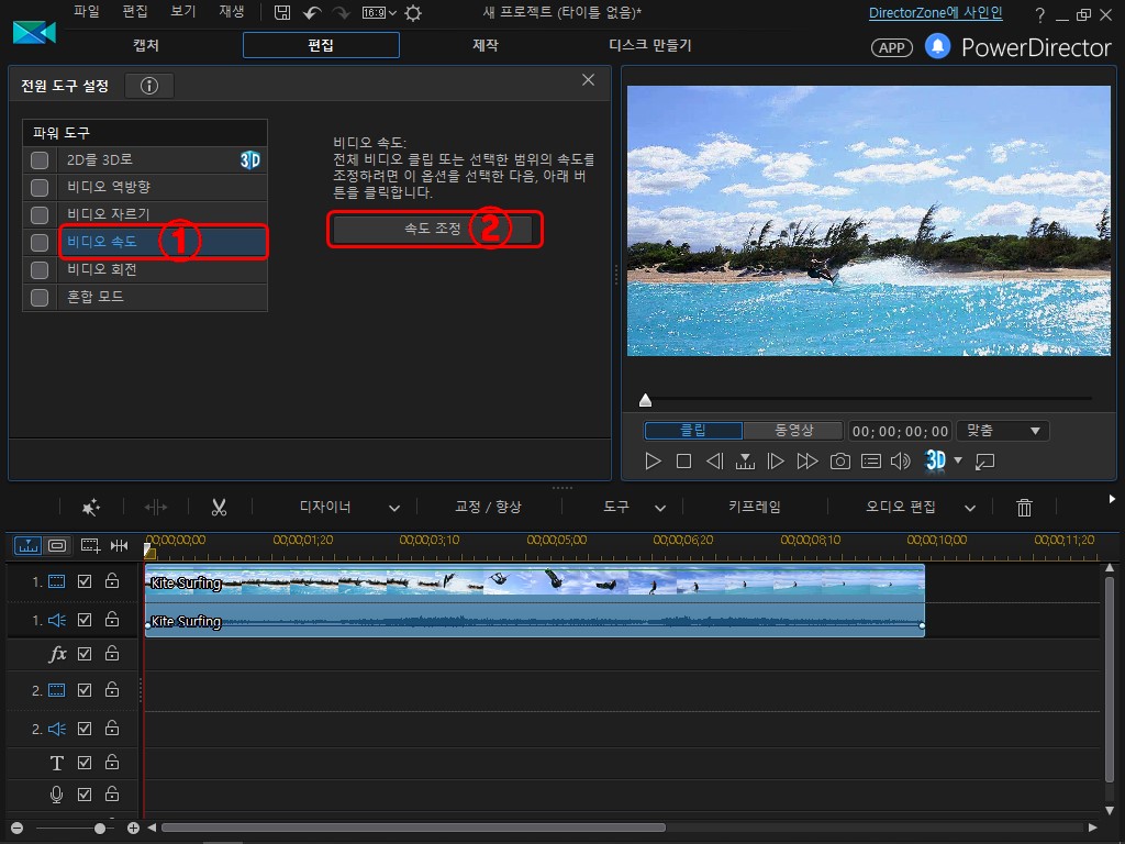 파워디렉터 샘플 동영상 중 Kite Surfing 영상을 실행해보면 영상의 속도가 느림을 확인할 수 있습니다.