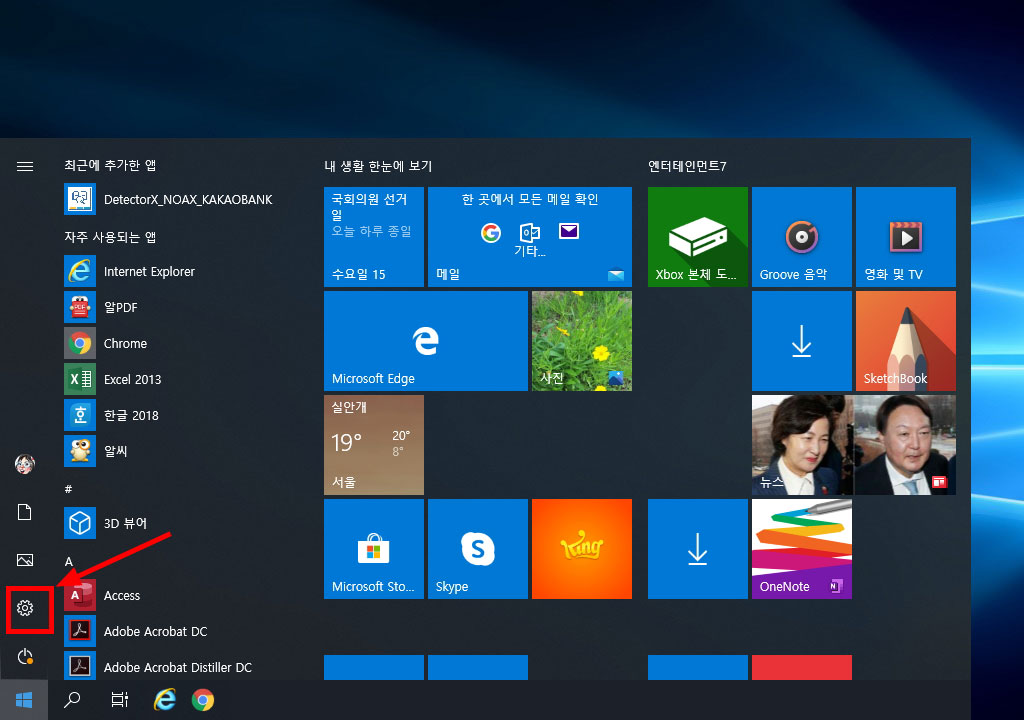 먼저 <시작> 단추를 클릭한 다음 [설정]을 클릭합니다.
