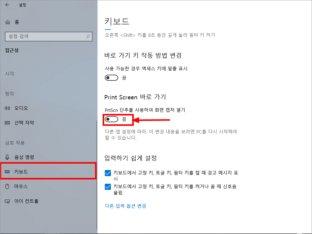 [키보드] > [Print Screen 바로 가기] 에서 '끔' 을 클릭하여