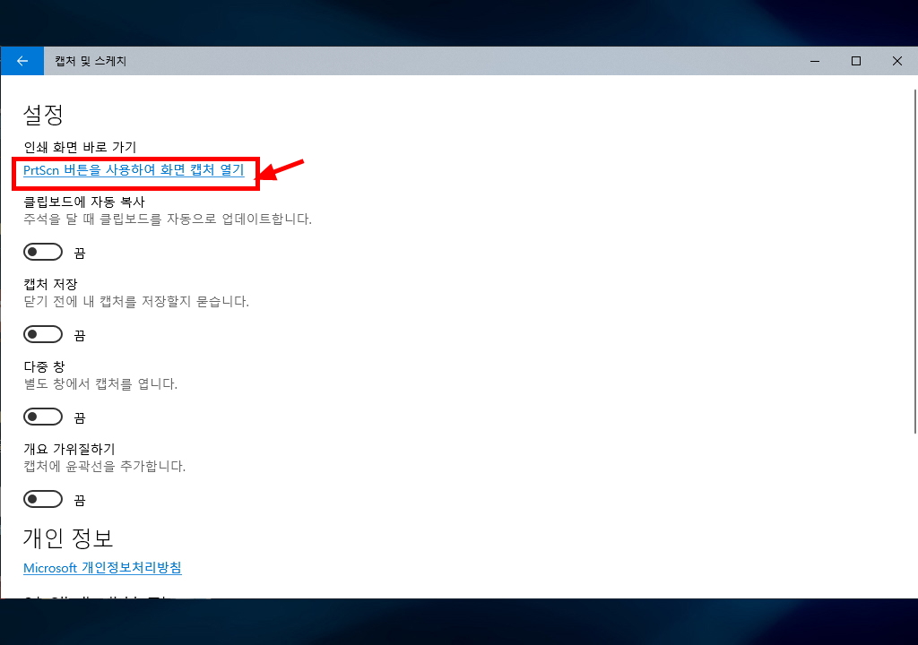 그리고 [PrtScn 버튼을 사용하여 화면 캡처 열기]를 클릭합니다.