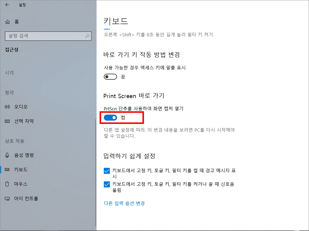 [키보드] > [Print Screen 바로 가기] 에서 '끔' 을 클릭하여
