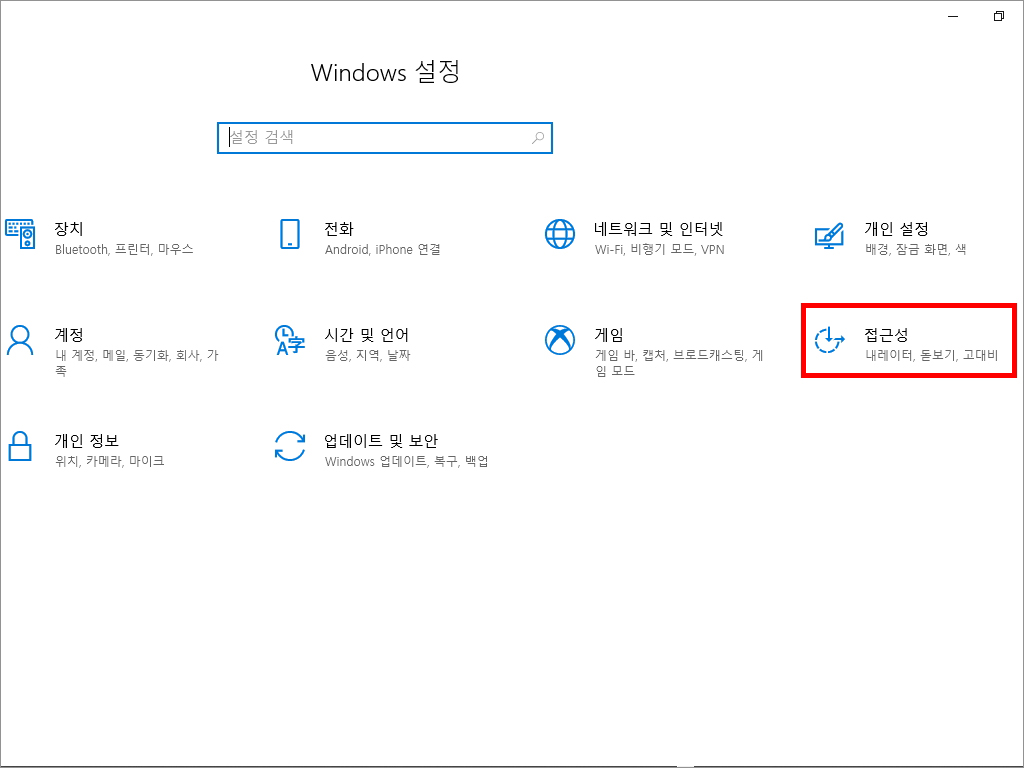 [Windows 설정] 창에서 [접근성] 클릭,