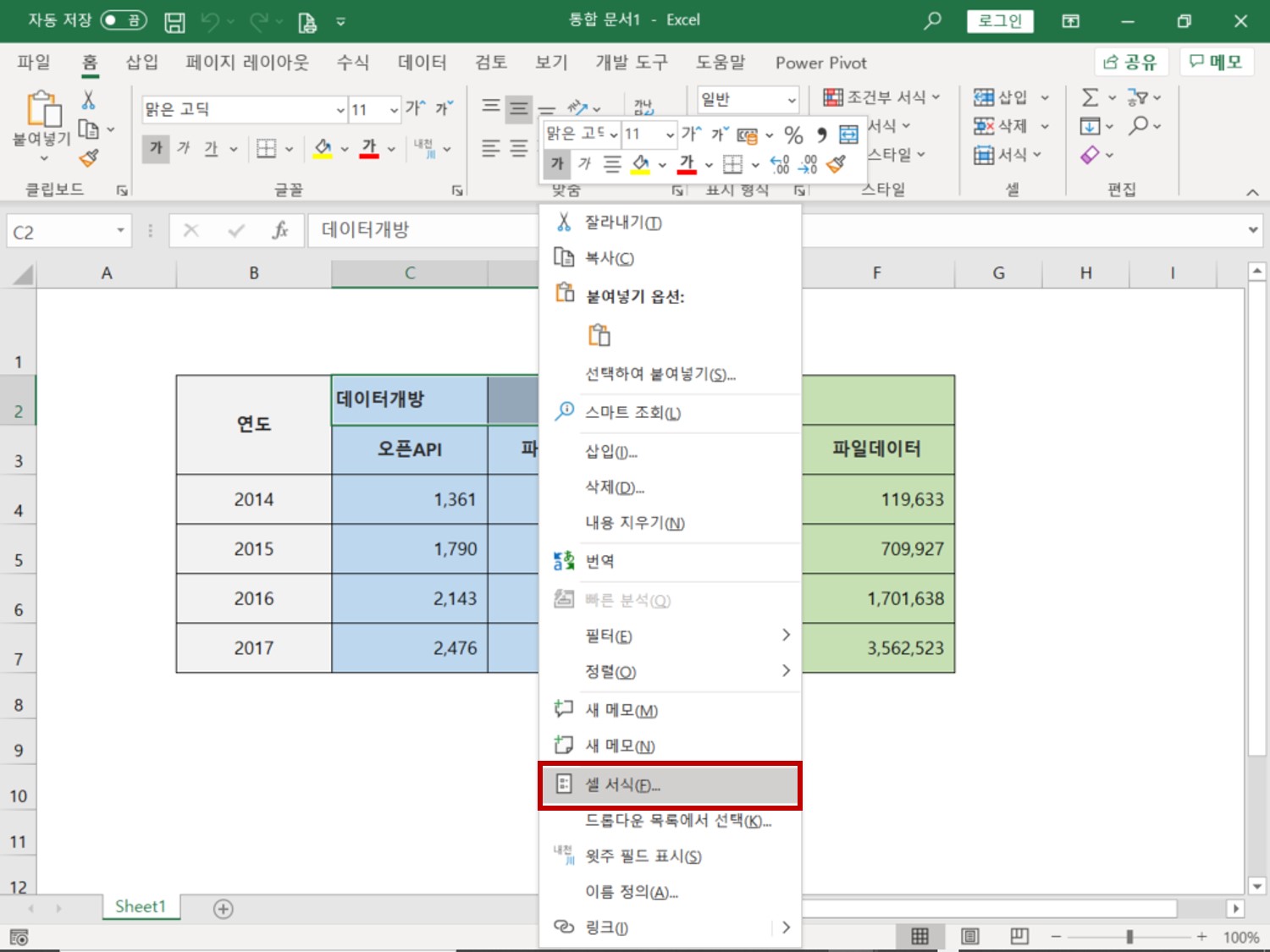 2. 마우스 오른쪽 단추를 클릭한 후 바로 가기 메뉴에서 [셀 서식]을 선택하거나 단축키 <Ctrl> + <1>을 누릅니다.