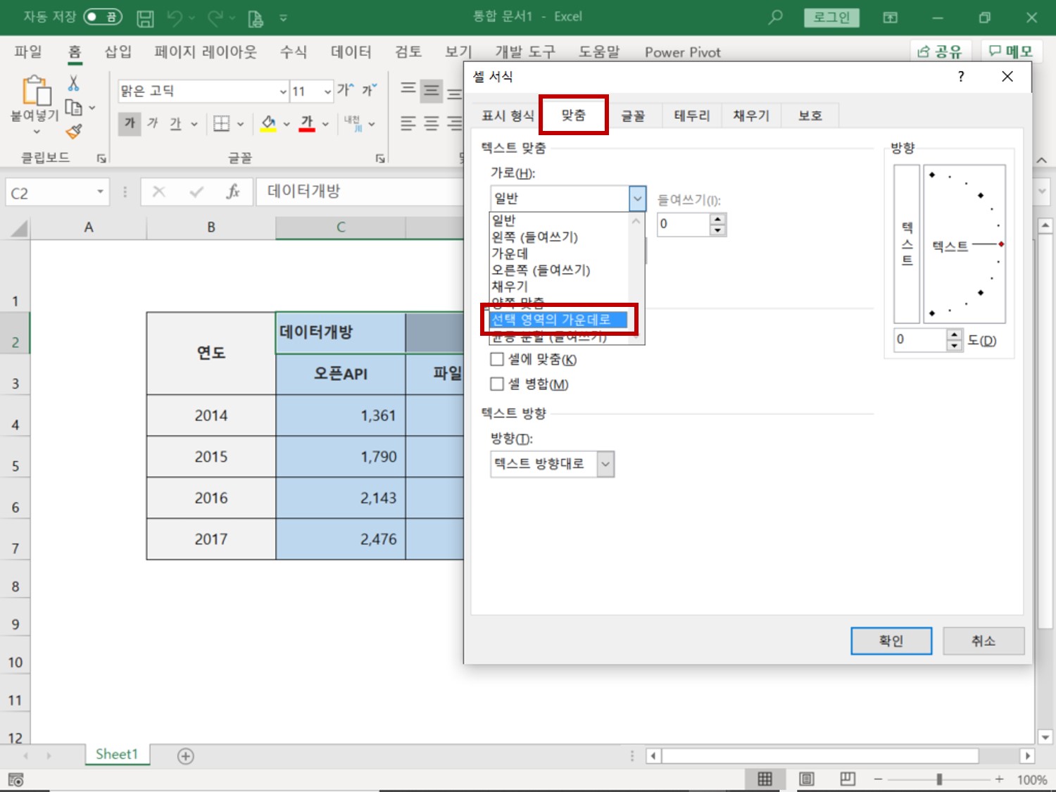 데이터를 병합하지 않고 가운데 영역으로 맞춤하는 기능에 대해 알아보겠습니다.