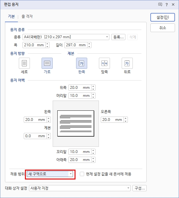 2. [편집 용지] 대화 상자의 [기본] 탭에서 다음 쪽부터 사용할 용지 종류, 용지 방향, 용지 여백을 설정하고 [적용 범위]를 '새 구역으로'로 선택한 후 <설정>을 클릭합니다.