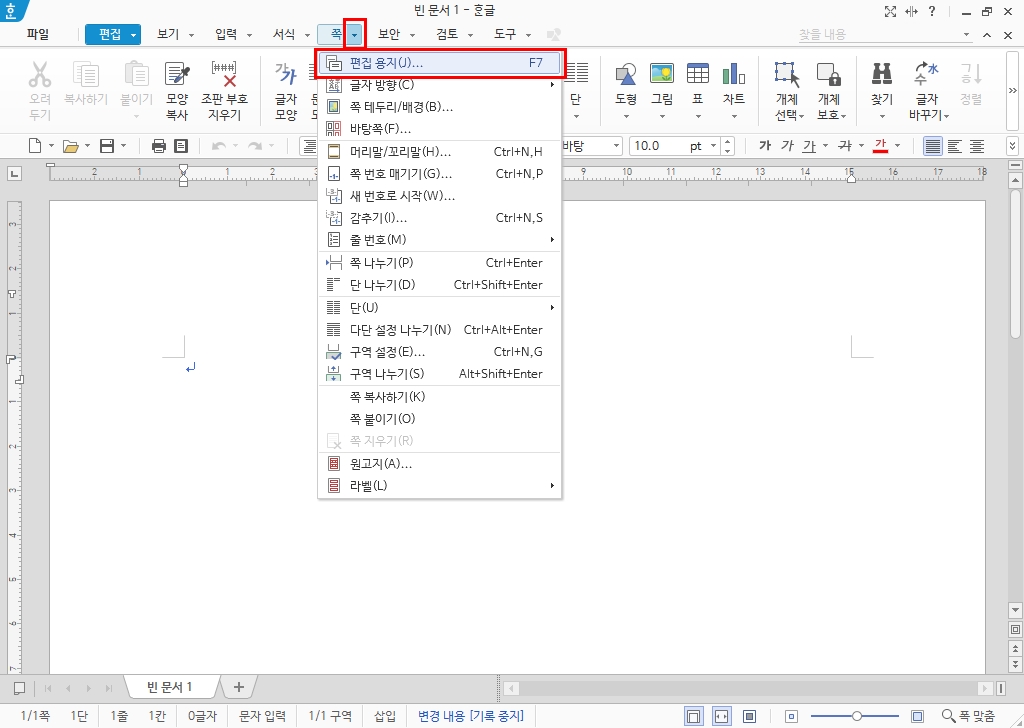 1. 편집 용지를 설정하고 작성 중인 문서의 마지막에 커서를 두고 [쪽]-[편집 용지] 메뉴를 선택하거나 [F7] 키를 누릅니다.