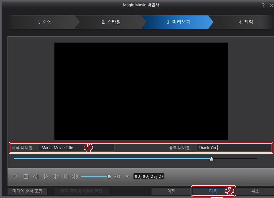 4. 미리보기 탭에서 [시작 타이틀]과 [종료 타이틀]을 입력한 후 [다음]을 클릭합니다.