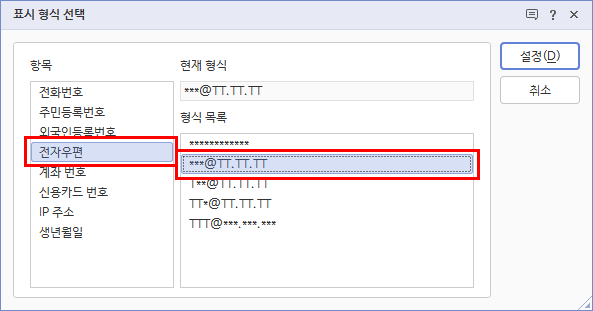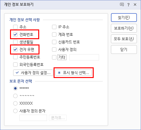 2. [개인 정보 보호하기] 대화 상자의 [개인 정보 선택 사항] 항목에서 전화번호와 전자우편에 체크 표시한 후 [표시 형식 선택]을 클릭합니다.