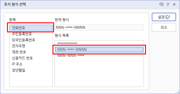 3. [표시 형식 선택] 대화 상자의 [항목]에서 전화번호를 선택하고 [형식 목록] 중 원하는 목록을 선택합니다.