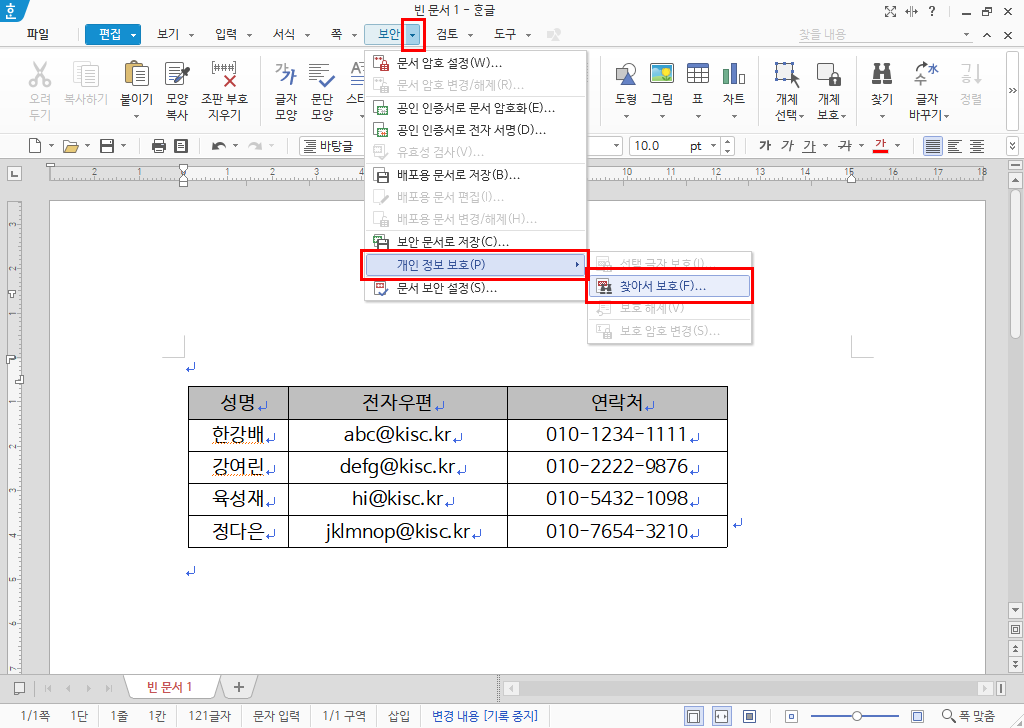 1. 전화번호나 전자우편이 입력된 문서의 맨 첫 줄에 커서를 두고 [보안]-[개인 정보 보호]-[찾아서 보호] 메뉴를 선택합니다.