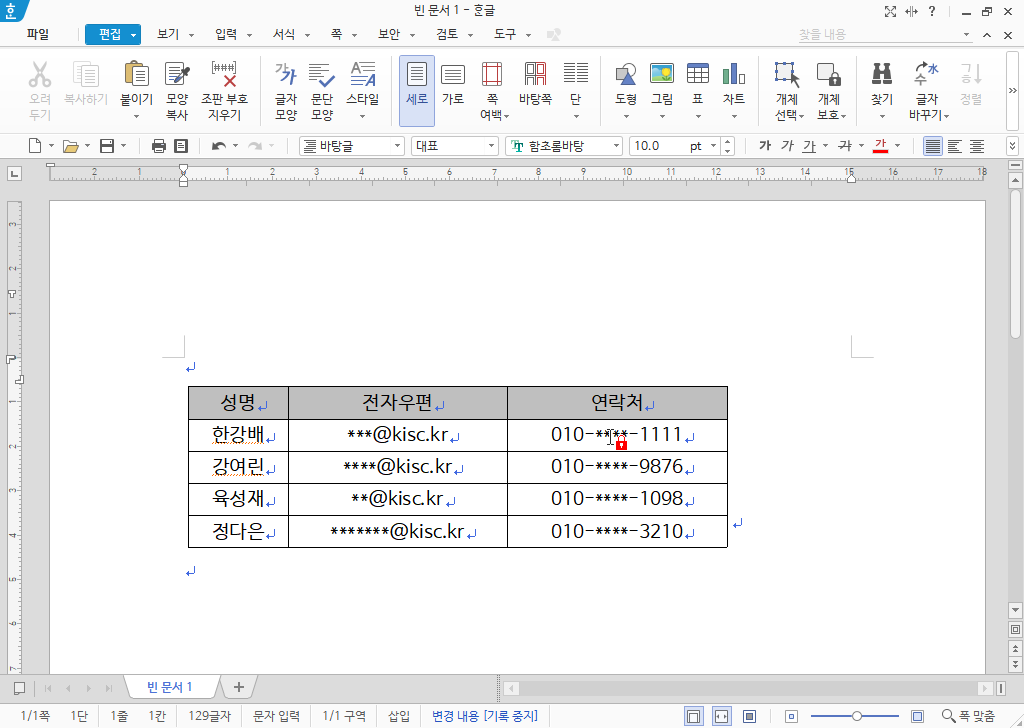 9. 현재 문서에 보안 암호가 지정되며 문서 내 모든 전화번호와 전자우편이 선택한 표시 형식으로 변경됩니다. ***로 변경된 부분에 마우스 커서를 올리면 자물쇠 모양의 커서로 변경되어, 해당 부분을 편집할 수 없음을 표시해 줍니다.
