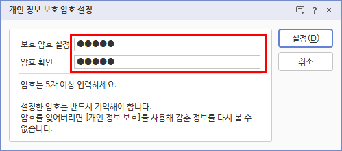 6. [개인 정보 보호 암호 설정] 대화 상자의 [보호 암호 설정]에 원하는 암호를 5글자 이상 입력하고 [암호 확인]에 같은 내용을 한 번 더 입력한 후 <설정>을 클릭합니다.