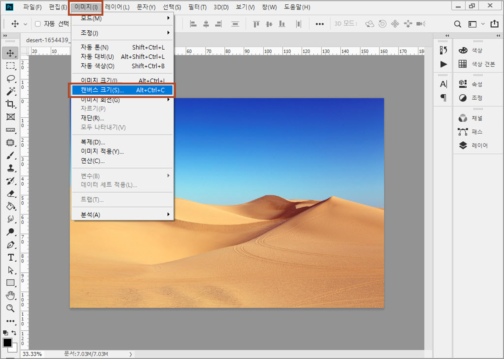 1. 포토샵에서 파일을 열고 [이미지]-[캔버스 크기]를 선택합니다.