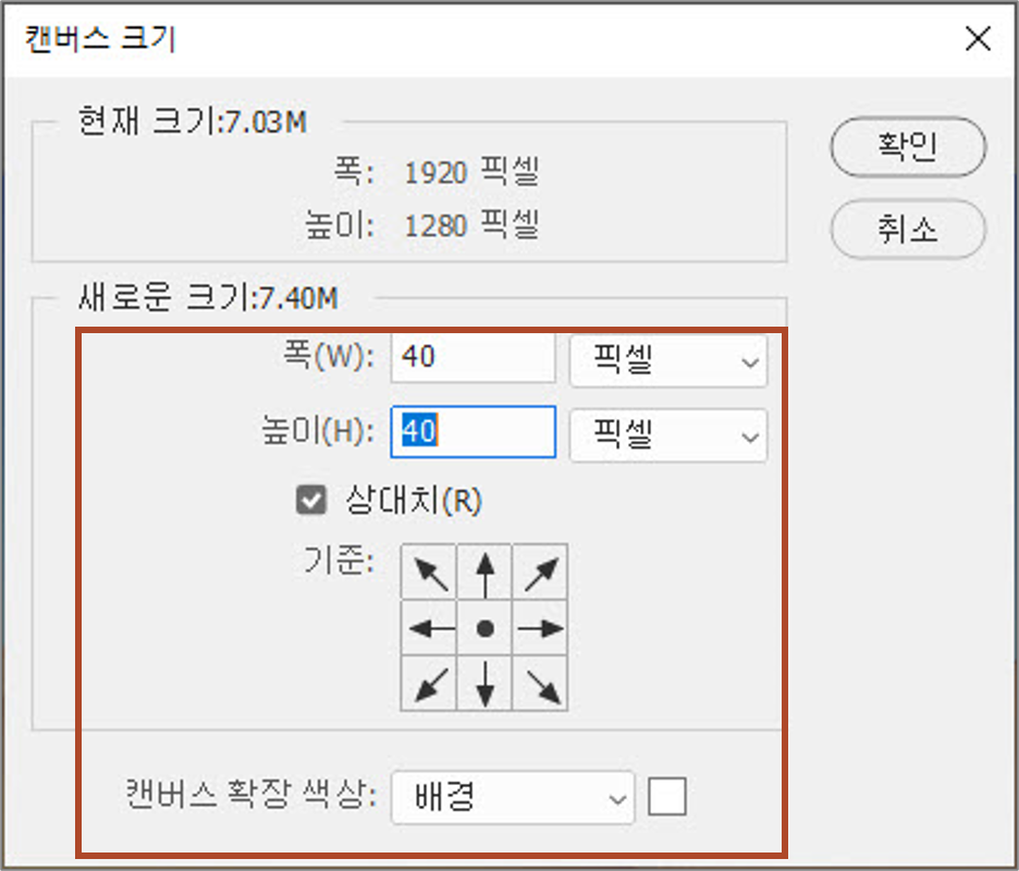 2. 먼저 '상대치' 옵션을 지정하여 조절할 크기만 지정할 수 있도록 변경합니다. 단위를 '픽셀'로 변경한 후 테두리로 사용할 크기를 지정합니다. 기준 위치는 정가운데를 지정하고 확장 색을 선택한 후 <확인>을 클릭합니다.
