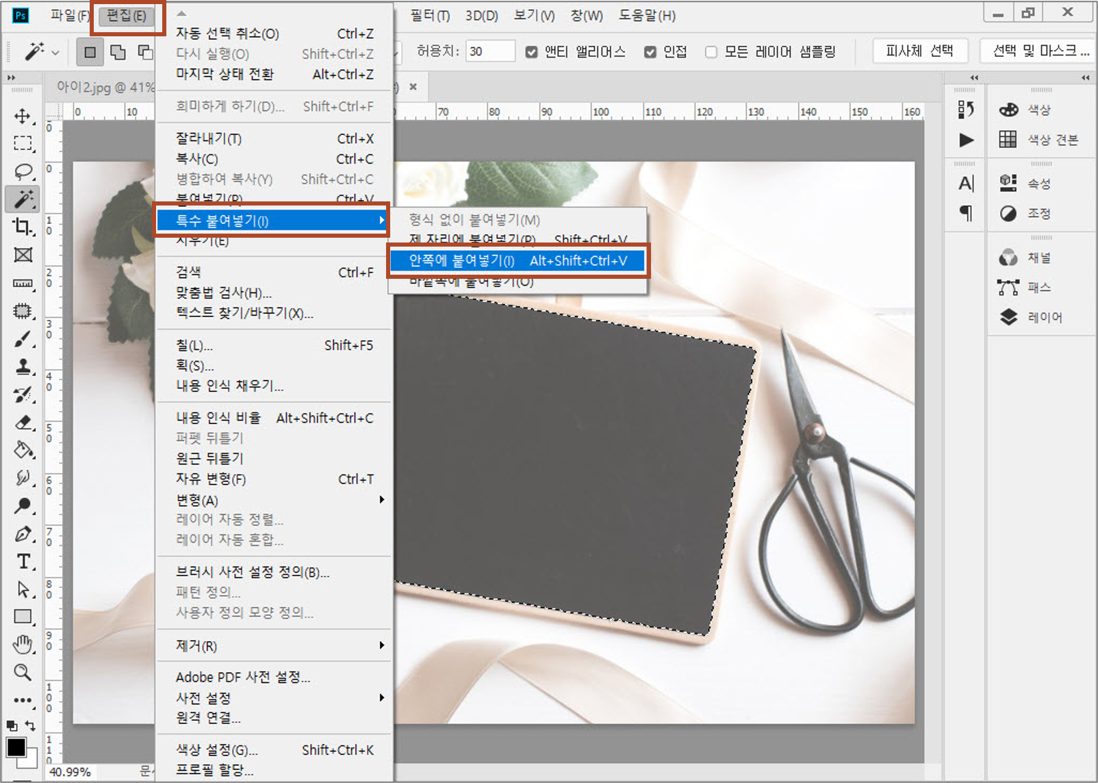 3. [편집]-[특수 붙여넣기]-[안쪽에 붙여넣기]를 선택합니다.