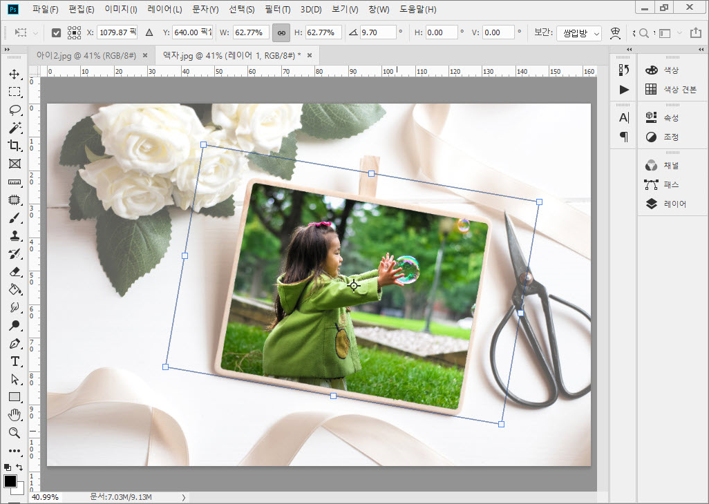 4. 액자 안에 사진이 합성되면 <Ctrl>+<T>를 눌러 변형 기능을 실행합니다. 가장자리의 조절점을 이용하여 크기와 방향을 조절합니다.