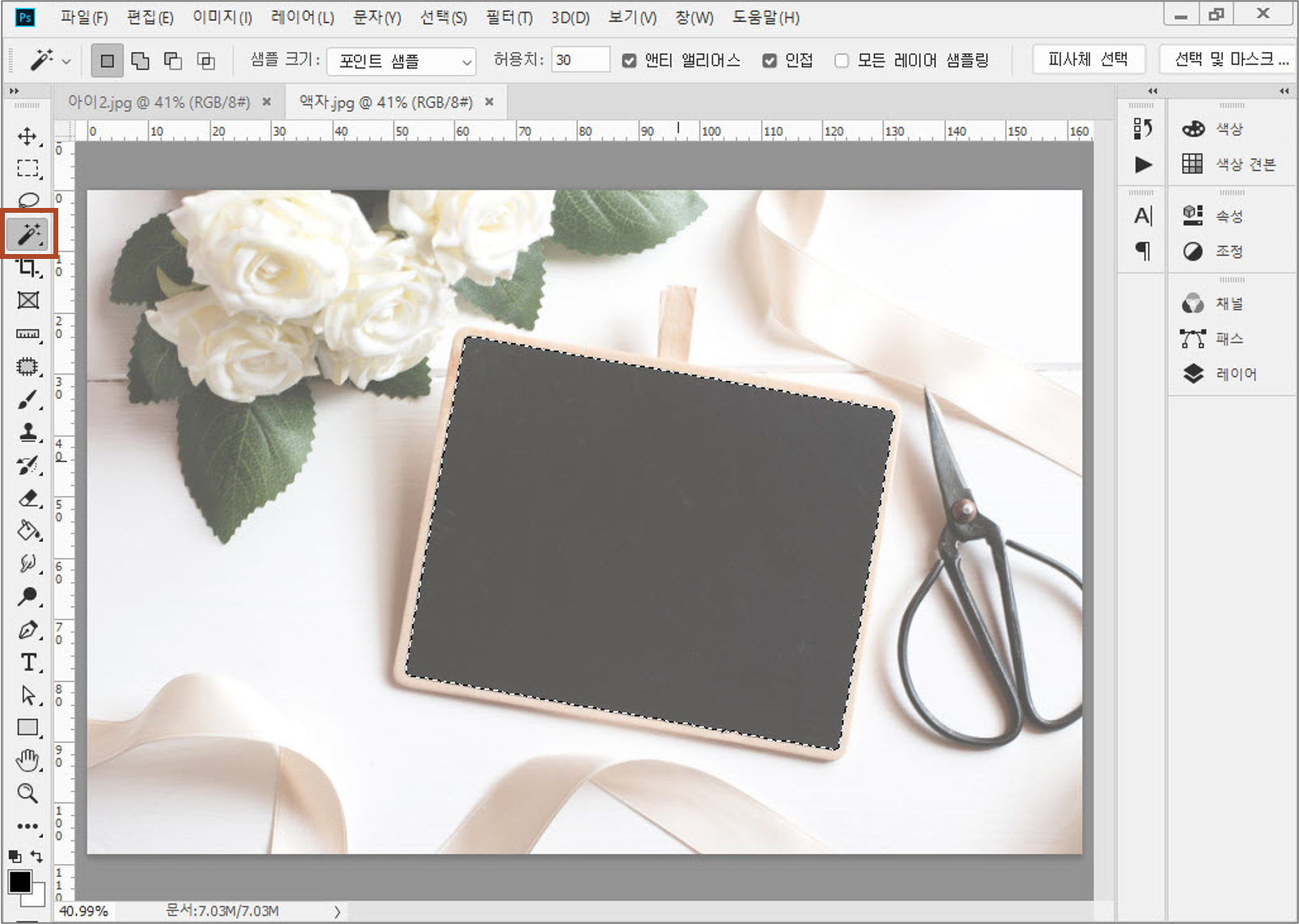 2. 액자 그림을 열고 도구 상자에서 [자동 선택 도구]를 선택한 후 액자의 내부를 클릭하여 영역으로 지정합니다.