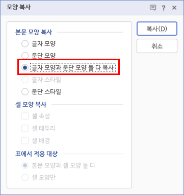 2. [모양 복사] 대화 상자의 [본문 모양 복사]에서 '글자 모양과 문단 모양 둘 다 복사'를 선택하고 <복사>를 클릭합니다.