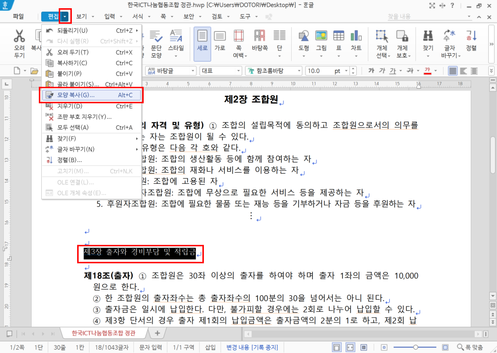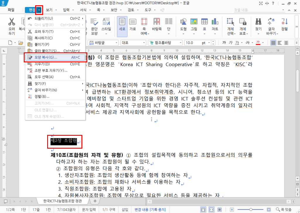 3. 동일한 글자 모양과 문단 모양을 지정할 문단을 블록으로 설정하고 [편집]-[모양 복사] 메뉴를 선택하거나 [Alt]+[C] 키를 누릅니다.