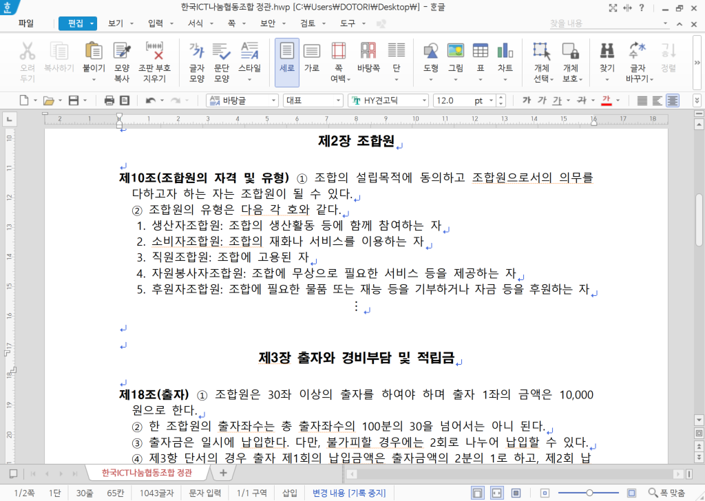 5. 블록으로 설정한 부분의 글자 모양과 문단 모양이 복사해 두었던 글자 모양과 문단 모양으로 바뀝니다.