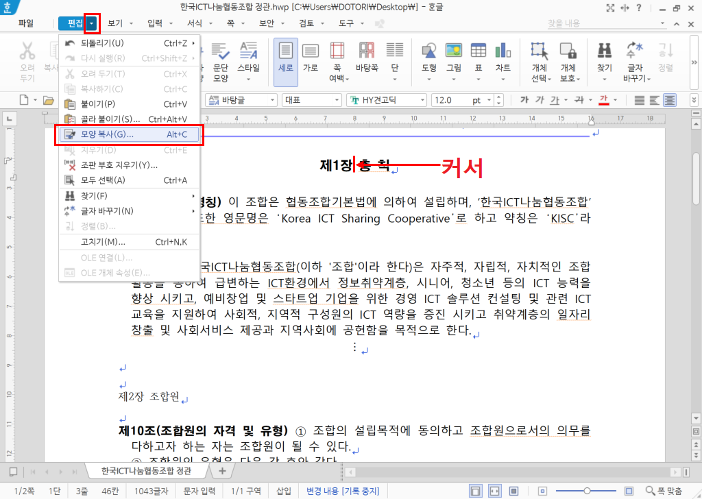 1.복사할 글자 모양과 문단 모양을 가진 문단 위에 커서를 두고 [편집]-[모양 복사] 메뉴를 선택하거나 [Alt]+[C] 키를 누릅니다.
