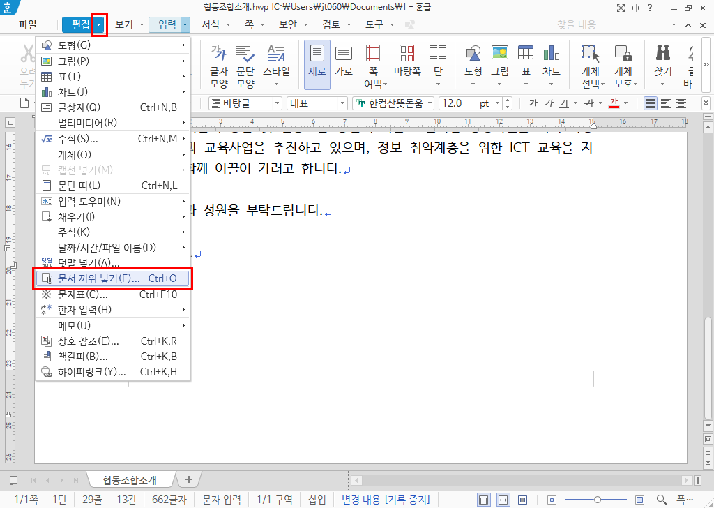 1. 편집하고 있는 문서에서 다음 쪽 부터 다른 문서 파일이 삽입되었으면 하는 위치에 커서를 두고 [입력]-[문서 끼워 넣기] 메뉴를 선택합니다.