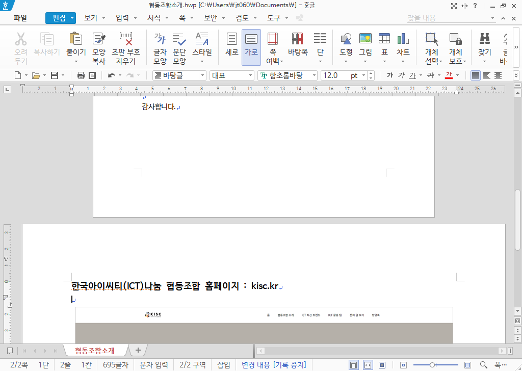 3. 편집하고 있는 문서의 커서 위치 다음 쪽에 끼워 넣기 위해 선택한 문서 파일 내용 전체가 글자 모양, 문단 모양, 스타일, 쪽 모양을 그대로 유지한 상태로 삽입됩니다.