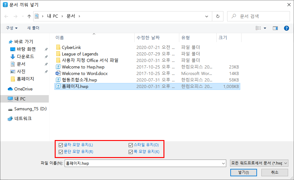 2. [문서 끼워 넣기] 대화 상자에서 현재 커서 위치 다음 쪽에 끼워 넣으려는 문서 파일을 선택하고 '글자 모양 유지', '문단 모양 유지', '스타일 유지', 쪽 모양 유지'에 체크 표시한 후 <넣기>를 클릭합니다.