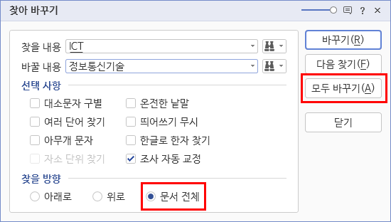 2. [찾아 바꾸기] 대화 상자의 [찾을 내용]에 현재 문서의 내용 중에 찾고자 하는 문자열을 입력하고 [바꿀 내용]에는 [찾을 내용] 자리에 바꾸어 써넣을 문자열을 입력합니다. [찾을 방향]을 '문서 전체'로 선택하고 <모두 바꾸기>를 클릭합니다.