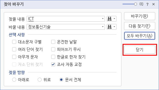 4. 찾아 바꾸기를 모두 완료했으면 [찾아 바꾸기] 대화 상자에서 <닫기>를 클릭합니다.