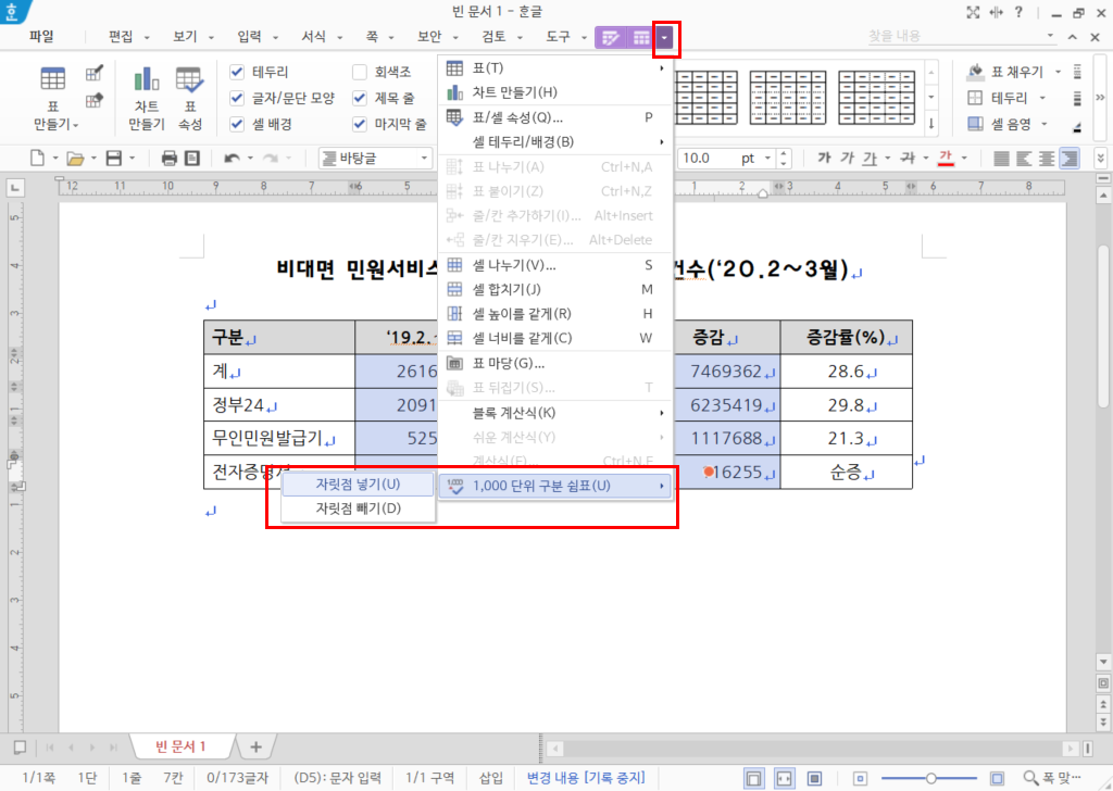 1. 1,000단위마다 자릿점을 넣을 셀을 블록 설정하고 [표]-[1,000 단위 구분 쉼표]-[자릿점 넣기] 메뉴를 선택하거나 [표 레이아웃] 탭에서 [1,000단위 구분 쉼표]-[자릿점 넣기]를 클릭합니다.