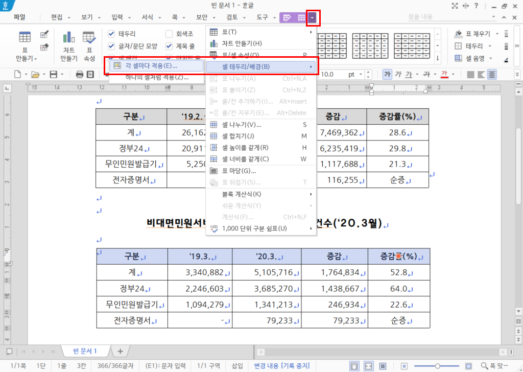 1. 배경색을 설정할 셀을 블록 설정하고 [표]-[셀 테우기/배경]-[각 셀마다 적용] 메뉴를 선택하거나 [C] 키를 누릅니다. 또는, [표 디자인] 탭에서 [표 채우기]를 클릭합니다.