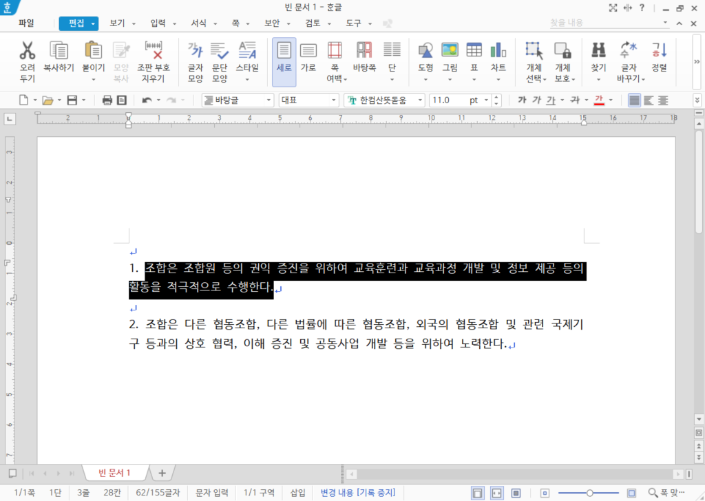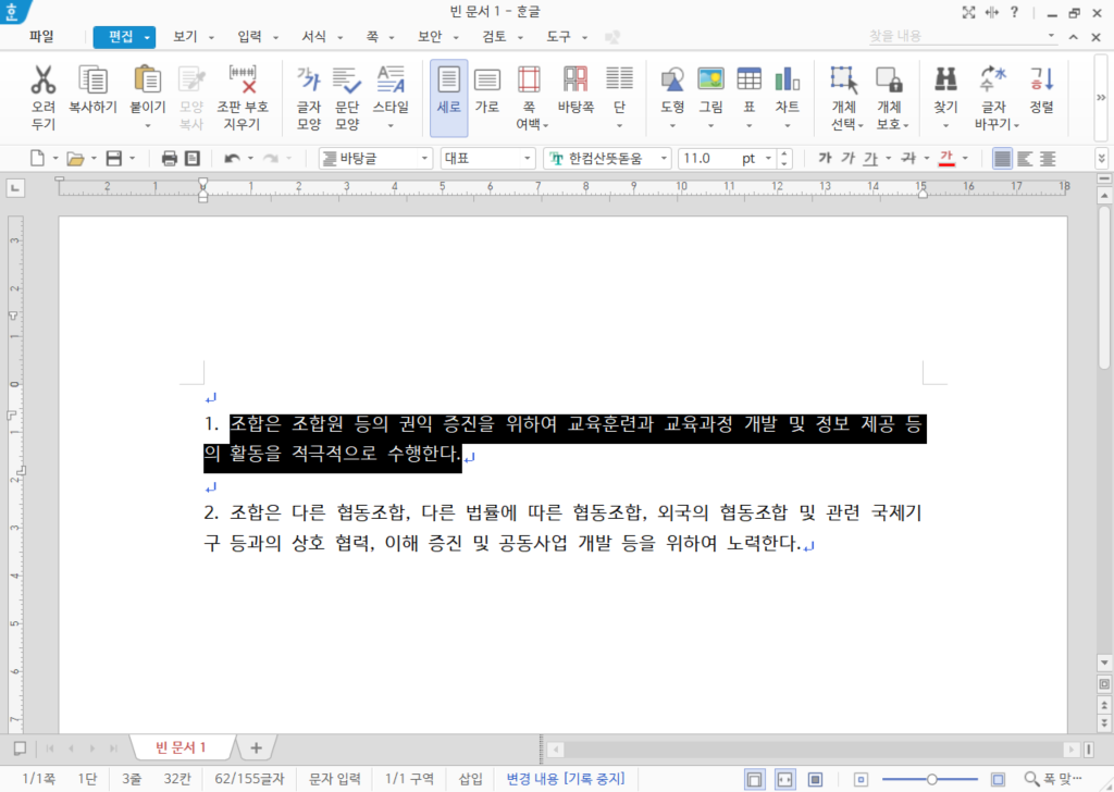 어절이나 단어가 나뉜 부분을 한 줄에 표시하기 위해서 자간을 조절합니다. 자간 조절 기능은 글자 모양에 해당하는 부분으로 [모양]-[글자 모양] 메뉴를 사용하여 설정할 수 있지만, 결과를 보면서 조절하는 것이 편리하므로 단축키를 사용하는 것이 편리합니다.