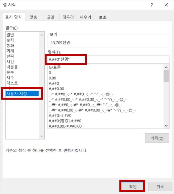 2. [셀 서식] 대화상자의 [표시 형식] 탭에서 [사용자 지정]을 선택하고 오른쪽 [형식]에 #,##0"천명" 을 입력한 후 [확인]을 클릭합니다.