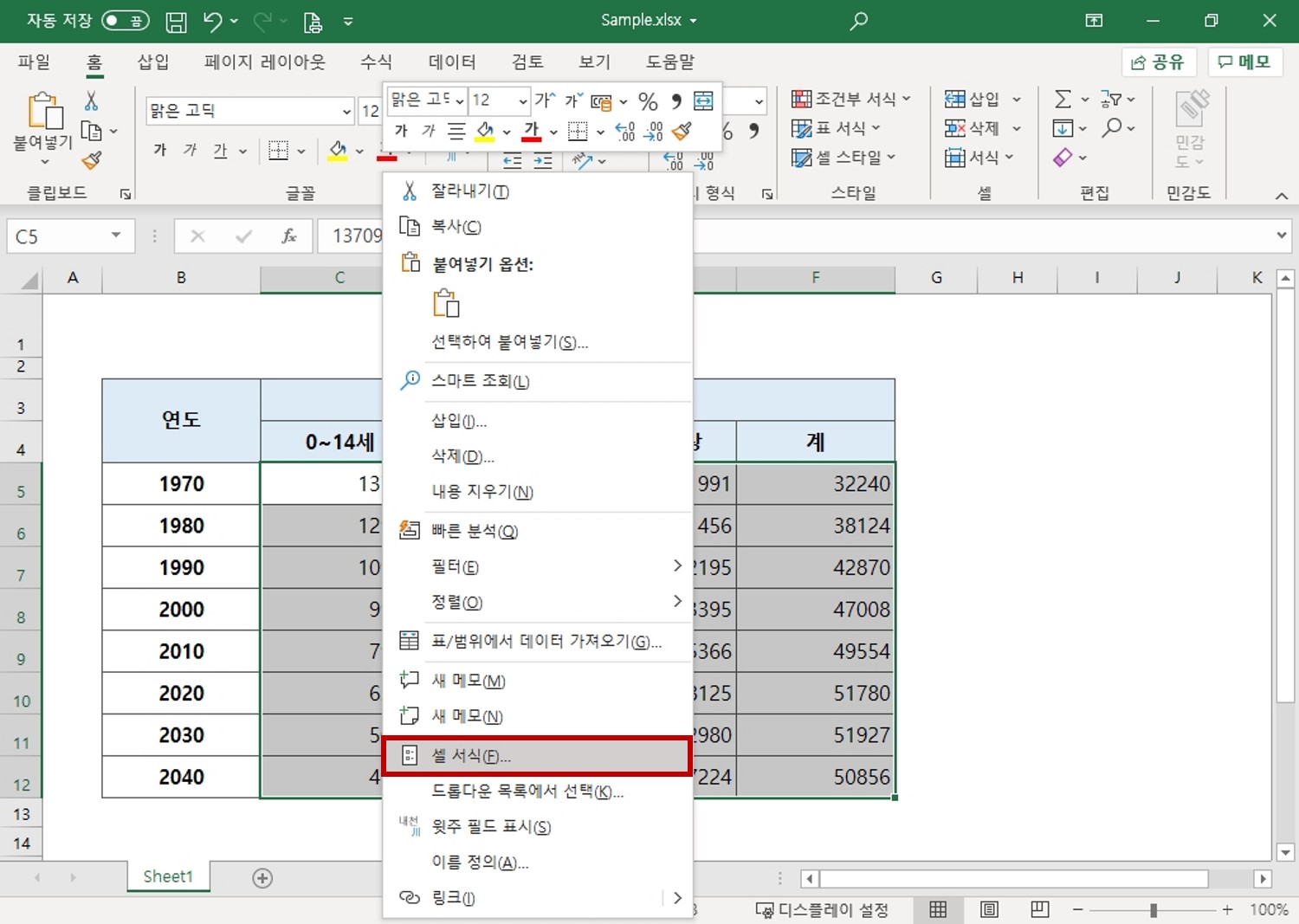 1. [C5:F12] 셀 범위를 선택한 후 마우스 오른쪽 단추를 누르고 [셀 서식]을 클릭합니다. [셀 서식] 대화상자를 실행하는 단축키는 <Ctrl> + <1>입니다.